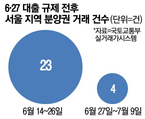 6·27 대출 규제 여파가 분양권 시장도 덮쳤다. 지난달 27일 이전 입주자모집공고를 한 단지는 주택담보대출 6억원 상한 규제 예외 대상이지만, 분양권 전매 시 매수자도 규제 대상에 포함되기 때문이다.