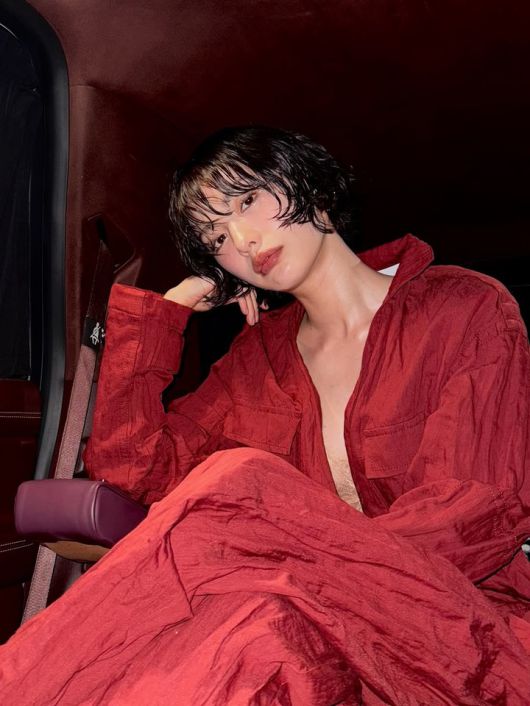 나나는 쇄골이 강조된 레드 셔츠 셋업을 입고 차량 내부에서 여유로운 포즈를 취하고 있다. 셔츠 안으로 은근히 드러난 레이스 소재의 이너웨어가 도발적이면서도 시크한 무드를 한층 강조했다.