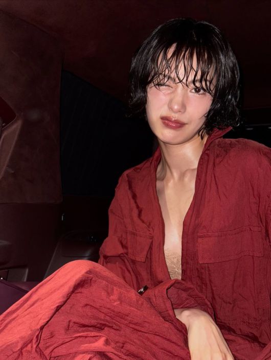 젖은 듯한 웻 헤어 스타일의 단발 컷과 광택감 있는 레드 립이 강렬한 의상과 어우러지며 치명적인 매력을 더한다.