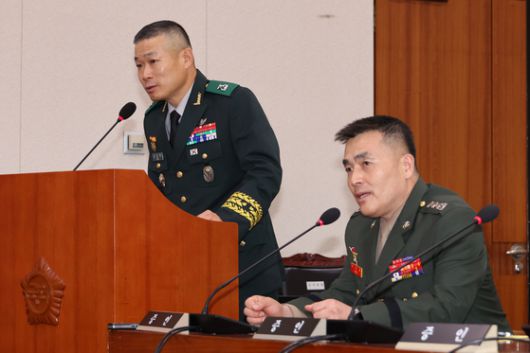 지난해 7월 19일 국회 법제사법위원회에서 열린 '윤석열 대통령 탄핵소추안 발의 요청' 국민동의 청원 청문회에서 김동혁 국방부 검찰단장(왼쪽)과 박정훈 전 해병대 수사단장이 항명 사건 수사 과정과 관련한 질문에 정반대의 대답을 하고 있다. 연합뉴스 |