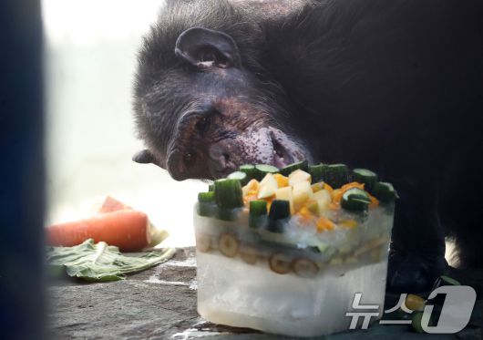 열흘 넘게 폭염이 계속된 9일 오후 대구 중구 달성공원에서 침팬지가 얼음 과일을 먹으며 더위를 식히고 있다. 2025.7.9/뉴스1 ⓒ News1 공정식 기자 |