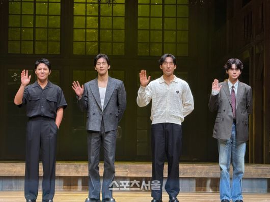 9일 연극 ‘셰익스피어 인 러브’ 프레스콜에서 ‘셰익스피어’ 역 (왼쪽부터) 이규형·손우현·이상이·옹성우가 단체 사진을 촬영하고 있다. 사진 | 표권향 기자 gioia@sportsseoul.com |