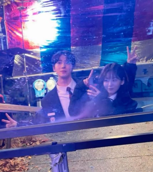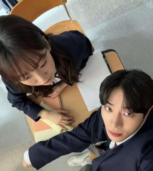 또한 조이현과 함께 장난스러운 셀카를 찍으며 현장 분위기를 따뜻하게 이끌었다. 특히 교실에서 사물함과 게시판을 배경으로 함께한 체육복 셀카에서는 풋풋한 고등학생 커플의 모습이 보여준다.