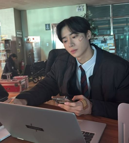 공개된 사진 속 추영우는 교복을 입은 채 노트북 앞에서 대본을 살핀다. 사진으로 다 담아내지 못하는 넓은 어깨와 아래로 내리뜬 눈이 팬들의 심장을 저격한다.