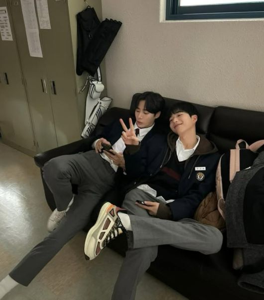또한, 극 중 표지호 역을 맡은 차강윤과 함께한 대기실 컷도 눈길을 끈다. 같은 교복 차림으로 소파에 앉아 휴식을 취하고 있는 두 사람은 각자의 휴대폰을 들고 여유를 즐기며 친근한 브로맨스를 보여줬다. 차강윤이 브이 포즈를 취하는 장면에서는 극 중에서 티격태격하는 관계와는 달리 실제로는 훈훈한 분위기를 자아낸다.
