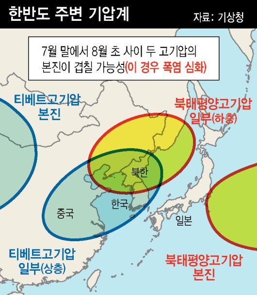 기록적 폭염의 기세가 연일 계속되는 가운데, 현재 우리나라를 덮어 폭염을 일으키고 있는 고기압이 ‘본진’이 아닌 ‘떨어져 나온’ 고기압들이란 분석이 나온다. 한여름 시기인 이달 말께 고기압의 본진이 한반도를 뒤덮게 되면, 지금보다 더 강한 폭염이 올 가능성도 제기된다.