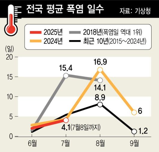 이날 기상청이 공개한 ‘최근 폭염 및 열대야 발생 현황’ 자료를 보면, 7월1~8일 전국 평균 폭염 일수는 4.1일로, 평년(1991~2020년) 7월 한달 동안의 폭염 일수와 같다. 통상 한달 동안 발생한 불볕더위가 이번엔 7월 초에 이미 발생해버린 것이다. 서울에서 2022년 처음 나타났던 ‘6월 열대야’는 올해로 4년 연속 나타나고 있다.