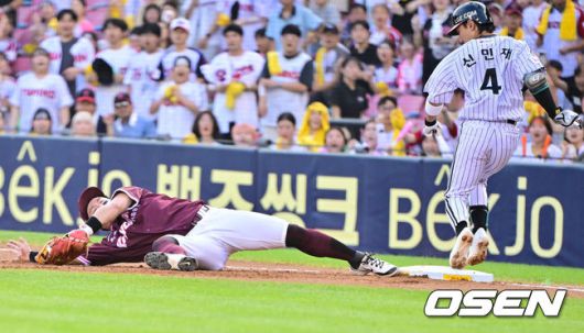 [OSEN=잠실, 박준형 기자] 9일 오후 서울 잠실구장에서 ‘2025 신한 SOL BANK KBO리그’ LG 트윈스와 키움 히어로즈의 경기가 진행됐다. 이날 경기에서 LG는 손주영을, 키움은 정현우를 선발투수로 내세웠다. 1회말 LG 선두타자 신민재의 내야땅볼때 최주환 1루수가 주자 신민재를 포스아웃시키고 있다. 2025.07.09 / soul1014@osen.co.kr