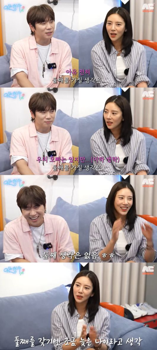 이어 둘째 가질 생각이 있는지를 물었고, 이에 손담비는 "전혀. 우리 오빠(이규혁)는 있지만"이라며 둘째를 갖기에는 늦은 나이라고 생각한다고 밝혔다.