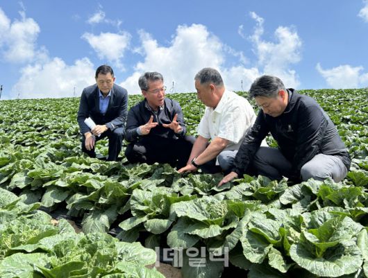 [이데일리 김태형 기자] 박서홍(왼쪽 두번째) 농협경제지주 농업경제대표이사는 9일 강원 강릉시 안반데기와 평창시 대관령 일대의 여름 배추·무 재배 포전을 방문해 생육동향을 점검하고 농가의 애로사항을 청취했다.