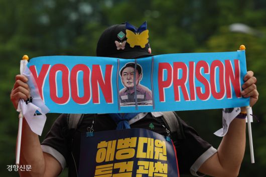 사진은 지난 7일 서울 서초구 ‘순직 해병 특검’ 사무실 앞에서 김계환 전 해병대 사령관의 출석을 기다리는 해병대 예비역의 모습이다.
