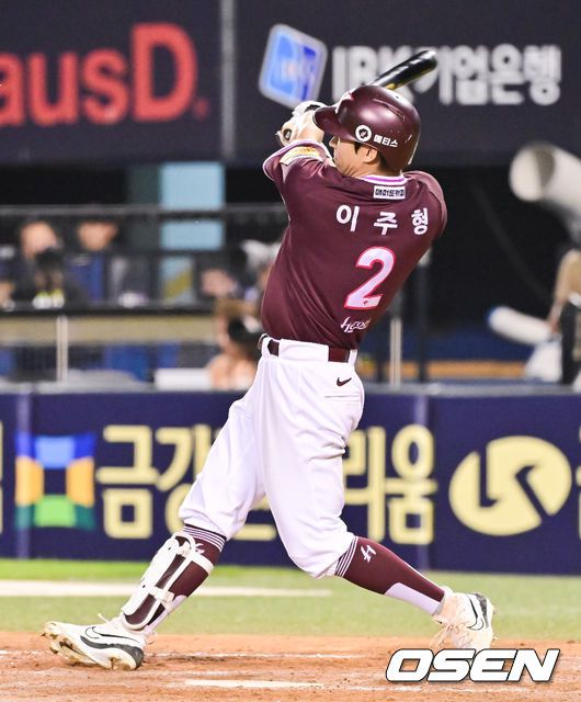 [OSEN=잠실, 박준형 기자] 9일 오후 서울 잠실구장에서 ‘2025 신한 SOL BANK KBO리그’ LG 트윈스와 키움 히어로즈의 경기가 진행됐다. 이날 경기에서 LG는 손주영을, 키움은 정현우를 선발투수로 내세웠다. 7회초 키움 선두타자 이주형이 솔로홈런을 날리고 있다. 2025.07.09 / soul1014@osen.co.kr