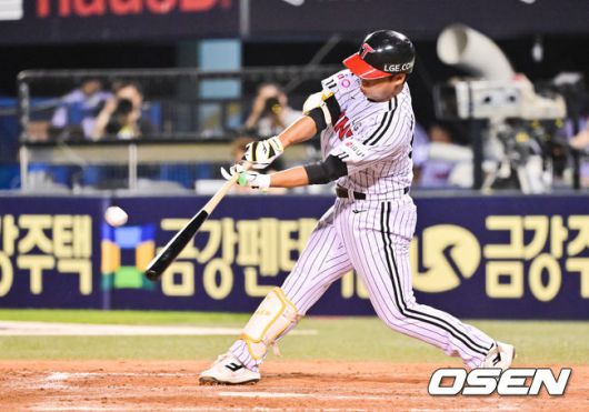 [OSEN=잠실, 박준형 기자] 9일 오후 서울 잠실구장에서 ‘2025 신한 SOL BANK KBO리그’ LG 트윈스와 키움 히어로즈의 경기가 진행됐다. 이날 경기에서 LG는 손주영을, 키움은 정현우를 선발투수로 내세웠다. 7회말 1사 1루 LG 박관우가 안타를 날리고 있다. 2025.07.09 / soul1014@osen.co.kr
