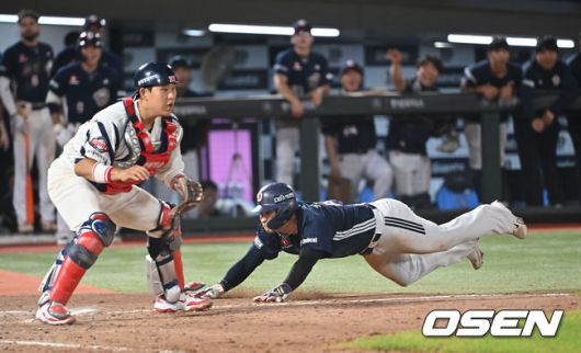 [OSEN=부산, 이석우 기자] 9일 부산 사직야구장에서 2025 신한 SOL 뱅크 KBO 리그 롯데 자이언츠와 두산 베어스의 경기가 열렸다. 홈팀 롯데는 이민석이, 방문팀 두산은 곽빈이 선발 출전했다. 두산 베어스 강승호가 9회말 2사 2루 이유찬의 역전 1타점 우익수 앞 안타때 홈으로 쇄도하고 있다. 2025.07.09 / foto0307@osen.co.kr