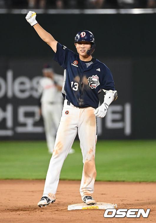 [OSEN=부산, 이석우 기자] 9일 부산 사직야구장에서 2025 신한 SOL 뱅크 KBO 리그 롯데 자이언츠와 두산 베어스의 경기가 열렸다. 홈팀 롯데는 이민석이, 방문팀 두산은 곽빈이 선발 출전했다. 두산 베어스 이유찬이 9회말 2사 2루 역전 1타점 우익수 앞 안타를 치고 2루가지 진출해 세리머니를 하고 있다. 2025.07.09 / foto0307@osen.co.kr