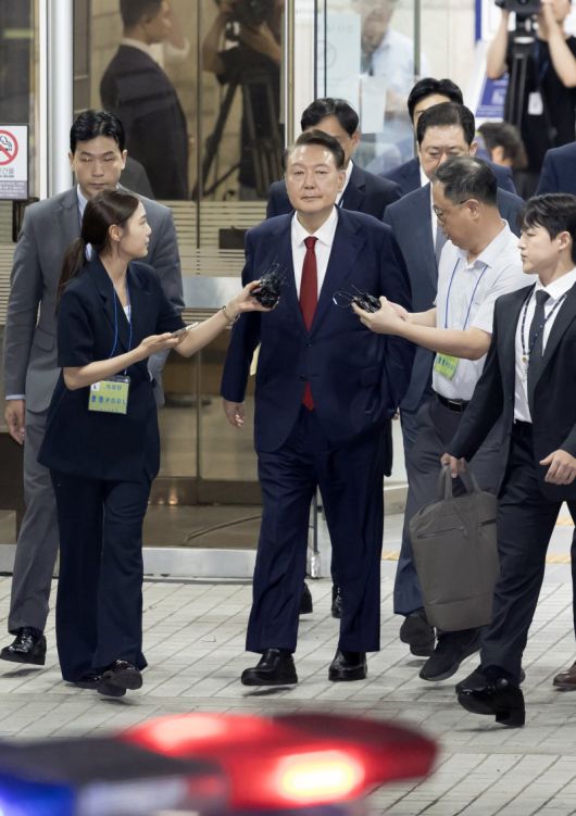 윤석열 전 대통령이 9일 서울 서초구 서울중앙지법에서 열린 직권남용 등 혐의 영장실질심사(구속 전 피의자 심문)를 마친 뒤 대기 장소인 서울구치소로 이동하기 위해 법원을 나서고 있다. /사진=뉴시스 |