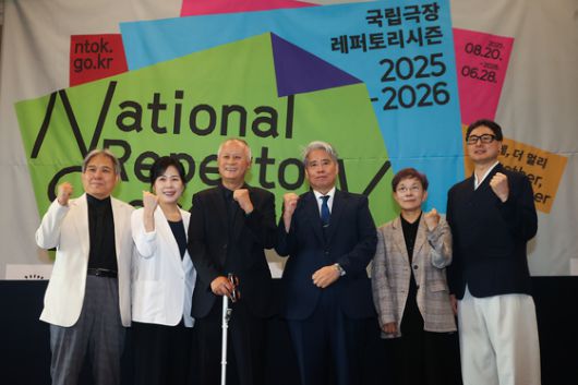 국립극장이 9일 2025~2026 시즌 레퍼토리를 공개했다. 이날 열린 기자 간담회에 참석한 채치성 국립국악관현악단 단장(왼쪽부터), 유은선 국립창극단 단장, 배우 송승환, 박인건 국립극장장, 박정희 국립극단 단장, 김종덕 국립무용단 단장. |