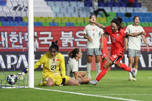 한국은 이날 전반 15분 중국의 야오웨이에 선제골을 내줬지만, 전반 추가시간 측면 수비수 장슬기의 득점포로 균형을 맞췄다. 장슬기는 상대 골키퍼가 쳐낸 공을 골지역 정면에서 그대로 슈팅으로 연결해 동점을 일궜다. 낮고 강하게 찬 공은 상대 수비수가 막으려 뻗은 다리를 맞고 꺾인 뒤 골망을 출렁였다.