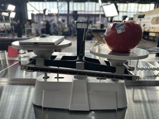 갤럭시 Z 폴드7(왼쪽)과 사과의 무게를 저울에 올려 비교해보고 있다. 사진=홍창기 기자 |