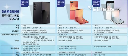 삼성전자는 국내에서 15일부터 갤럭시Z7시리즈 사전 판매를 시작한다. 사전예약자는 저장용량 업그레이드(더블 스토리지)를 비롯해 갤럭시 워치8 시리즈 할인 쿠폰, 정품 액세서리 할인, 구글 AI 프로 6개월 무료 구독권, '갤럭시 AI 구독클럽' 이용 혜택 등이 제공된다. 공식 출시는 오는 25일이다.