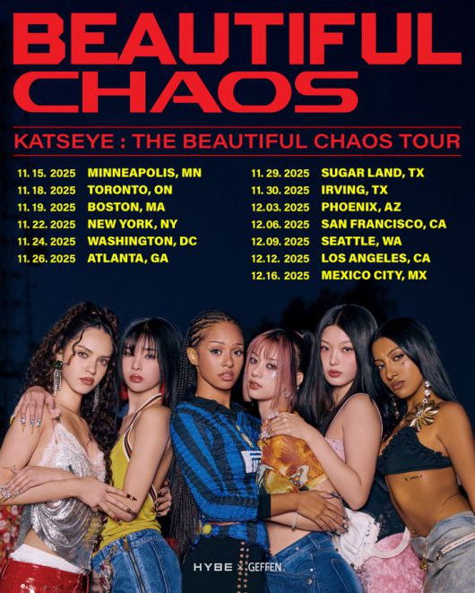 하이브와 게펜 레코드는 8일(현지시간) 팀 공식 SNS를 통해 'KATSEYE: The BEAUTIFUL CHAOS Tour' 일정을 공개했다.