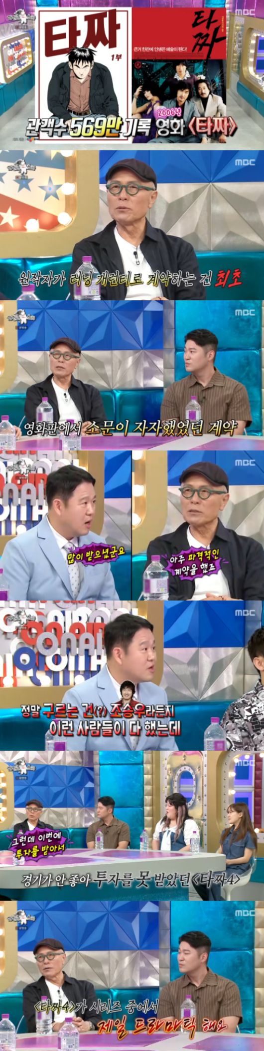 그리고 또 김구라는 허영만의 만화 중 영화화가 된 '타짜'를 언급하면서 "타짜가 관객수가 청소년관람불가인데도 569만명이 들었다"고 했다. 이에 허영만은 "요즘같으면 1000만 넘는 것과 마찬가지"라고 설명했다.