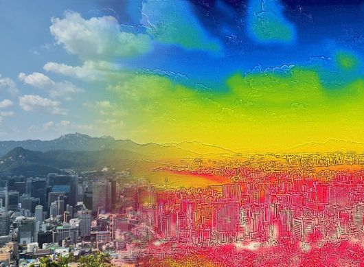 9일 남산에서 열화상 카메라로 촬영한 서울 도심이 붉게 표시돼 있다. 온도가 높을수록 붉게, 낮을수록 푸르게 보인다. 정상 촬영한 사진(왼쪽)과 열화상 사진을 하나로 합성했다. [연합뉴스] |