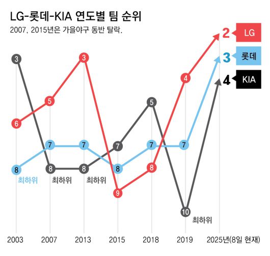 이로부터 10년이 지난 올해 분위기가 극적으로 바뀌었다. 엘롯기 동맹은 ‘앞에서’ 2∼4위에 이름을 올리고 있다. 8일 현재 LG 2위, 롯데 3위, KIA 4위다. 이대로 정규시즌이 끝나면 LG, 롯데, KIA 세 팀이 나란히 포스트시즌 무대를 밟는 사상 초유의 장면이 연출된다. 1982년 프로야구 출범 후 지난해까지 43년 동안에는 엘롯기 동맹 세 팀이 ‘가을 야구’ 무대에 동반 진출한 적이 한 번도 없었다.