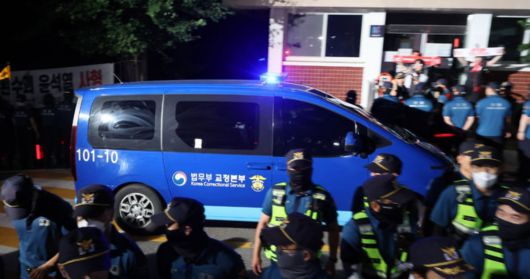 윤석열 전 대통령을 태운 법무부 호송차량이 지난 9일 오후 경기 의왕시 서울구치소로 들어가고 있다. 뉴시스 |