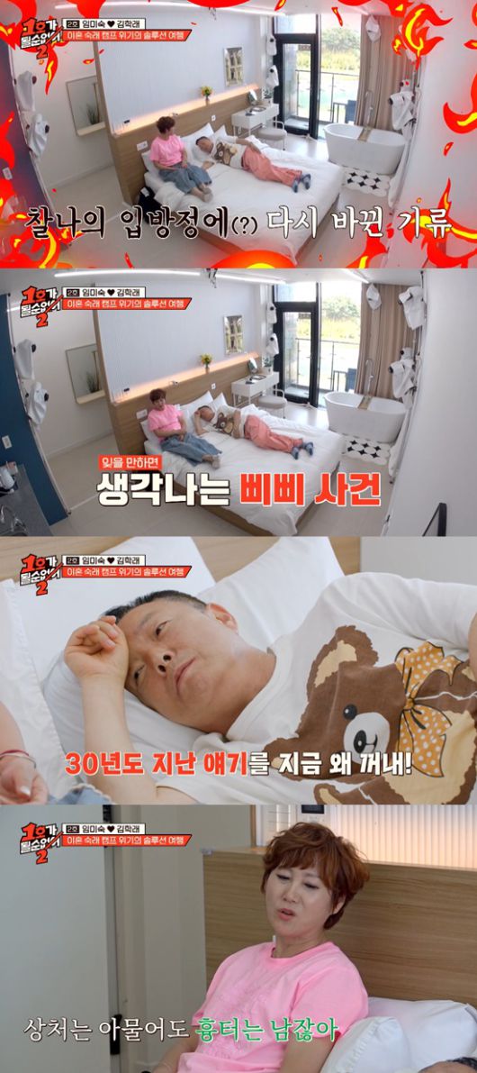 10년 간 각방을 써왔다는 임미숙은 "너무 어색하고 긴장됐다. 남의 남자 만나는 기분이었다"고 웃었다. 여행에 나서는 순간부터 투닥거리며 충돌이 있었던 김학래는 "예쁜 미숙이가 쌓이거 풀어라"면서 손을 잡으며 화해의 시그널을 보냈다.