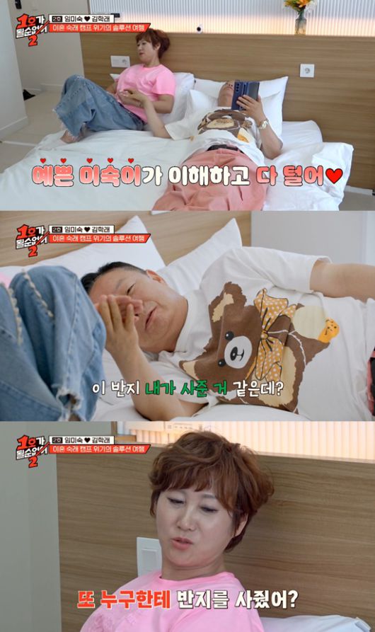 그런데 분위기를 풀던 중 김학래가 "이 반지 내가 사준 거 아니냐. 정말 잘 어울린다"고 하자 임미숙은 표정이 굳으며 "또 누구한테 반지를 사준 거냐. 나한테 반지 한 번도 사준 적 없지 않나"라고 이야기했다.