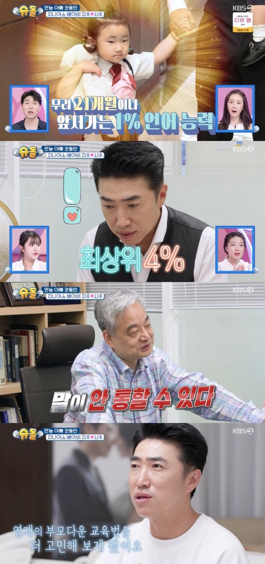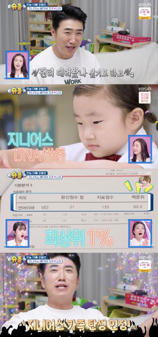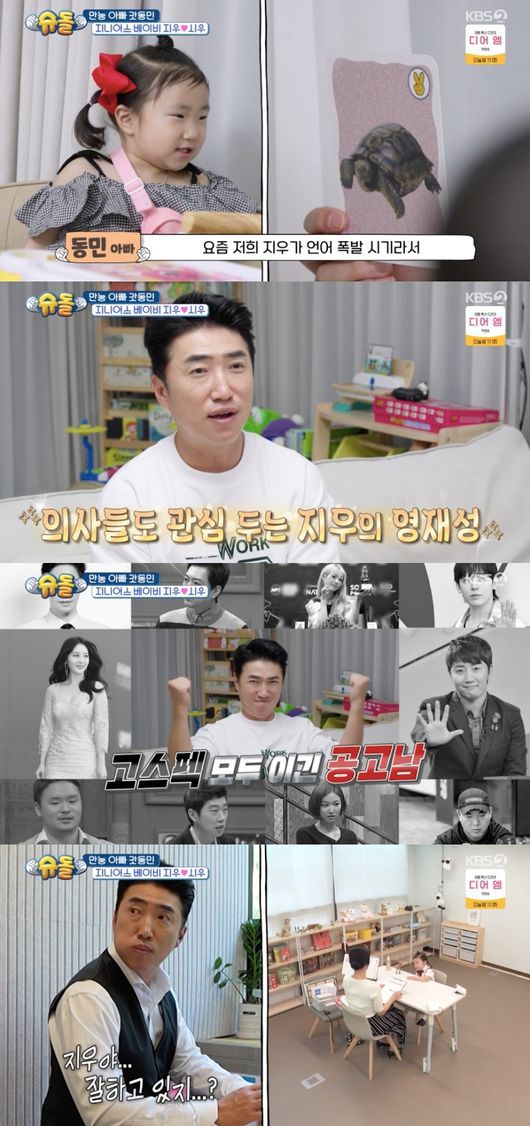 9일 방송된 KBS2 예능 ‘슈퍼맨이 돌아왔다’(이하 ‘슈돌’)에서는 아빠 장동민의 지니어스 DNA를 물려받은 35개월 지우가 영재검사를 받았다.