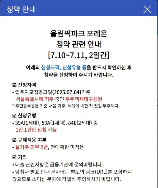 ‘로또 청약’으로 불리는 서울 강동구 올림픽파크포레온(올파포) 무순위 청약이 한국부동산원 청약홈에서 10일 오전 9시부터 이틀간 진행된다. 시세차익만 최대 15억 원에 달하지만 보존등기 미완료로 인해 주담대와 잔금대출이 모두 불가능하다. 4가구 공급에 서울 거주 무주택자라면 누구나 신청 가능하다. 다만 당첨 시 분양가 전액을 현금이나 2금융권 대출로 마련해야 하며 실거주 2년 조건도 있다.