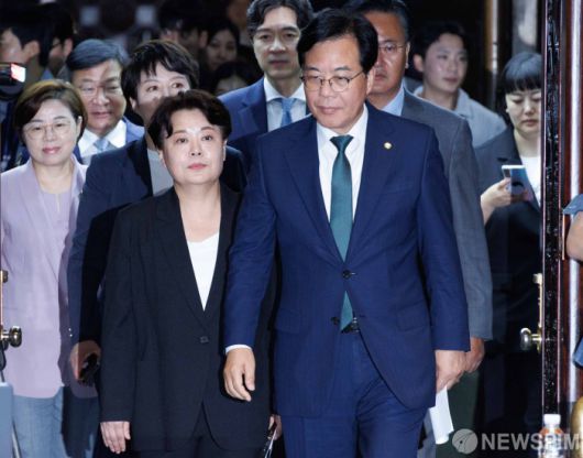 [서울=뉴스핌] 윤창빈 기자 = 송언석 국민의힘 비상대책위원장 겸 원내대표, 윤희숙 혁신위원장이 9일 오후 서울 여의도 국회에서 열린 긴급 의원총회에 참석하고 있다. 2025.07.09 pangbin@newspim.com |