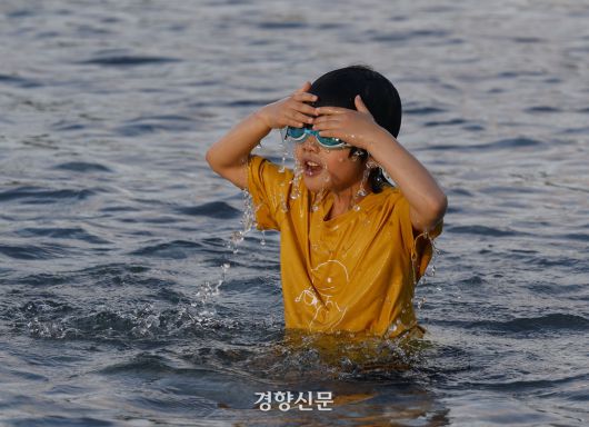 서울 전역에 올해 첫 폭염주의보가 발효된 지난달 30일 여의도 물빛광장을 찾은 어린이가 물속에 뛰어들어 더위를 식히고 있다. 문재원 기자 |