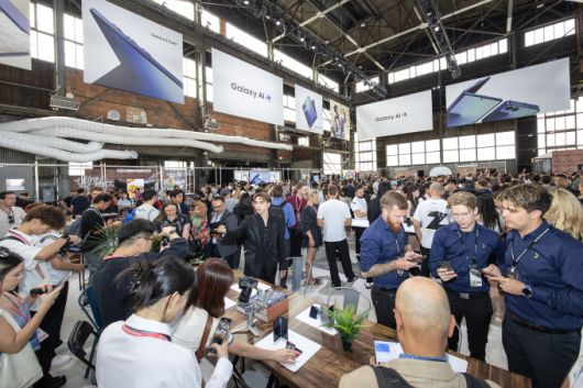 9일(현지시간) 미국 뉴욕 브루클린에 위치한 듀갈 그린하우스(Duggal Greenhouse)에서 개최된 하반기 '갤럭시 언팩 2025'에서 신제품을 체험하는 관객들. [사진=삼성전자] |