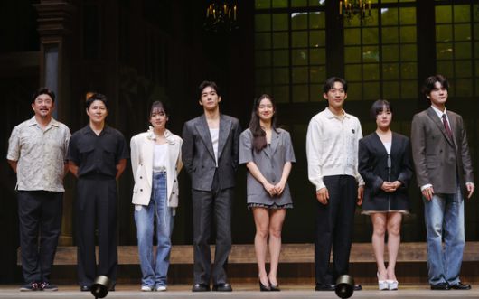 9일 서울 서초구 예술의전당 CJ토월극장에서 열린 연극 '셰익스피어 인 러브' 기자간담회에서 배우 임철형(왼쪽부터), 이규형, 이주영, 손우현, 박주현, 이상이, 김향기, 옹성우가 포즈를 취하고 있다. 〈사진=연합뉴스〉 |