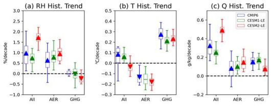 연구팀은 온실가스와 에어로졸의 영향을 각각 분리해 파악하기 위해 단일 인위 강제력 실험을 한 결과 온실가스는 지표면 온도를 상승시켜 상대습도를 낮추는 반면, 에어로졸은 지표면 온도를 낮추어 상대습도를 높이는 정반대의 효과를 보였다. 온실가스만 변화시킨 경우 수증기는 증가했지만, 온도 상승으로 인해 상대습도는 오히려 감소하는 경향을 보인 반면, 에어로졸만 변화시킨 경우에는 지표면 온도가 떨어지면서 상대습도가 상승하는 결과가 나타났다.