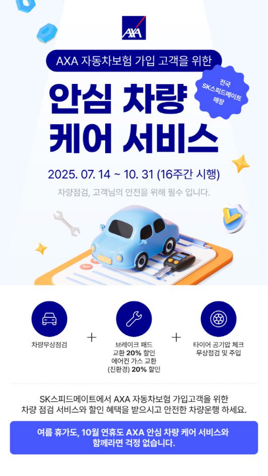 악사손보는 이번 서비스를 오는 7월 14일부터 10월 31일까지 총 16주간 운영한다. 기존 하계 시즌 한정으로 운영하던 서비스를 추석 연휴가 있는 10월까지 확대한 것으로, 장거리 운전이 많은 시기인만큼 차량 점검을 통해 안전 운행에 도움을 줄 것으로 기대된다. 서비스는 전국 약 600여개 스피드메이트 매장에서 제공되며, 악사손보의 개인용 자동차보험 가입 고객이라면 누구나 가까운 지점을 방문해 이용할 수 있다.