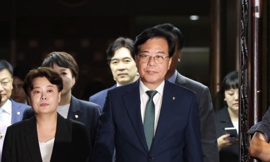 송언석 국민의힘 비상대책위원장 겸 원내대표와 윤희숙 신임 혁신위원장이 9일 서울 여의도 국회에서 열린 의원총회에 입장하고 있다. 연합뉴스 |