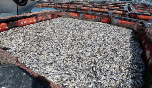 전남 연안에서 어민들이 고수온 피해 최소화를 위해 그물에 가득 잡힌 물고기의 긴급 방류 작업을 하고 있다. |