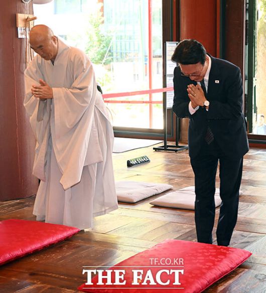 [더팩트ㅣ임영무 기자] 김민석 국무총리(오른쪽)가 10일 오전 서울 종로구 조계종 조계사 대웅전에서 예불하고 있다.