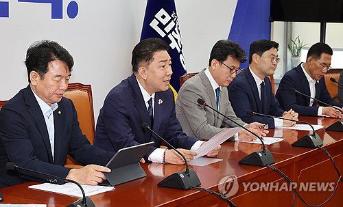 (서울=연합뉴스) 김주형 기자 = 더불어민주당 김병기 당 대표 직무대행 겸 원내대표(왼쪽 두번째)가 10일 국회에서 열린 정책조정회의에서 발언하고 있다. 2025.7.10