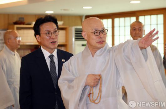 [서울=뉴스핌] 청사 사진기자단 = 김민석 국무총리가 10일 오전 서울 종로구 조계종 조계사 관음전에서 조계종 총무원장(진우 스님) 등 불교계 지도자들을 예방했다. 김민석 국무총리가 진우 스님과 대화하고 하고 있다. 이날 진우 스님을 비롯해 기획실장인 법오 스님, 사회 부장인 진경 스님, 문화부장인 혜공 스님, 사서실장인 일감 스님이 참석했다. 2025.07.10 photo@newspim.com |