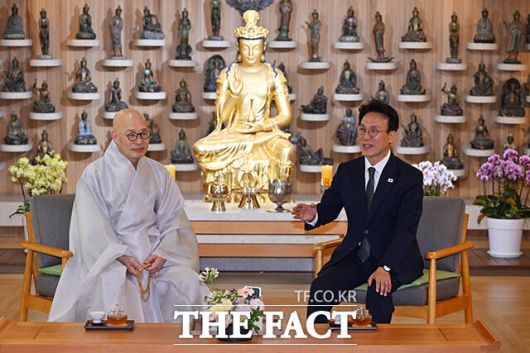 [더팩트ㅣ임영무 기자] 김민석 국무총리가 10일 오전 서울 종로구 조계사 대웅전을 찾아 진우 조계종 총무원장을 예방하고 있다.