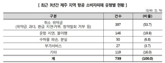 항공 관련 피해의 절반 이상은 항공권 취소 시 위약금 분쟁으로, 전체의 53.7%(397건)를 차지했다. 이는 전자상거래로 구매한 항공권이 '전자상거래법' 상 청약철회 대상임에도 불구하고 일부 사업자가 이를 거부하거나, 특가 항공권 및 탑승 임박 항공권의 환불 제한 조건을 두고 있어 분쟁이 발생한 것으로 분석된다.