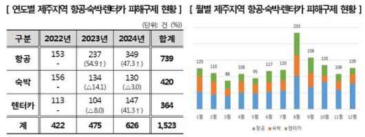 최근 3년간(2022~2024년) 한국소비자원에 접수된 제주 지역 항공, 숙박, 렌터카 관련 피해구제 신청은 총 1523건이었다. 이 가운데 항공 관련 피해가 739건으로 가장 많았으며, 숙박 420건, 렌터카 364건이 뒤를 이었다.