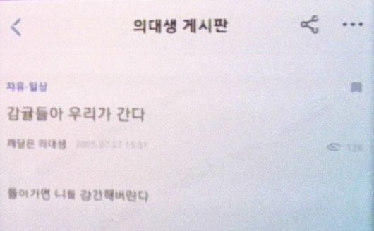 사진 형태로 공유된 글을 보면 의대생 게시판에는 '감귤들아 우리가 간다'라는 제목의 글이 올라왔습니다. 글 본문에는 '돌아가면 니들 강간해버린다'는 내용이 있었습니다.