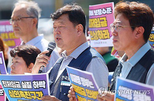 (서울=연합뉴스) 김도훈 기자 = 10일 서울 용산구 대통령집무실 인근에서 양대노총 관계자들이 최저임금 심의촉진구간 규탄 기자회견을 하고 있다.