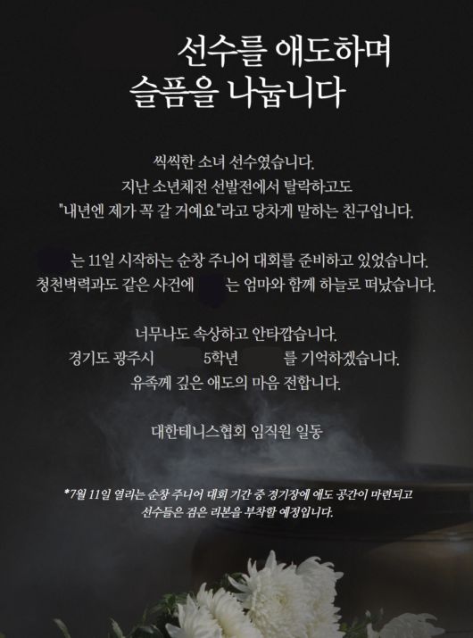 대한테니스협회의 A양 애도 게시물. [대한테니스협회 공식 홈페이지] |